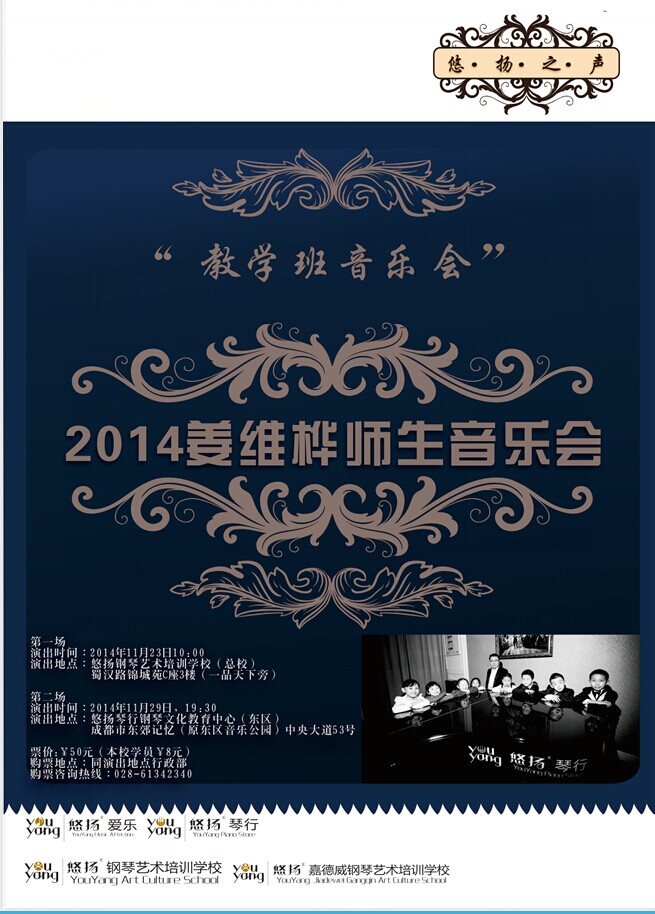 演出时间:姜老师教学班音乐会第二场时间是2014年11月29日,19:30
